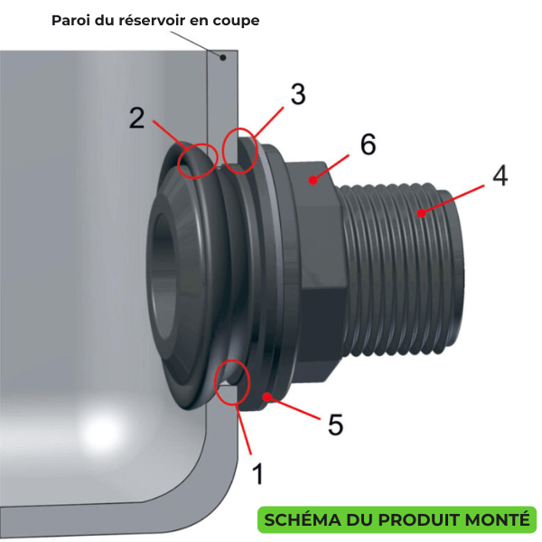 - Le vissage de l'écrou permet au joint de se plaquer contre la paroi de la cuve assurant ainsi une parfaite étanchéité.