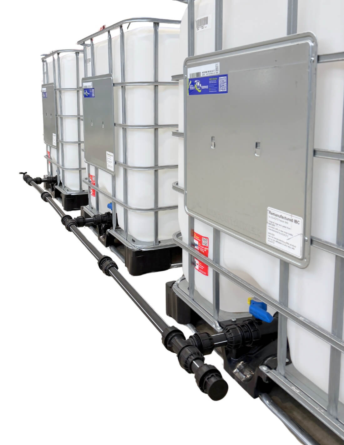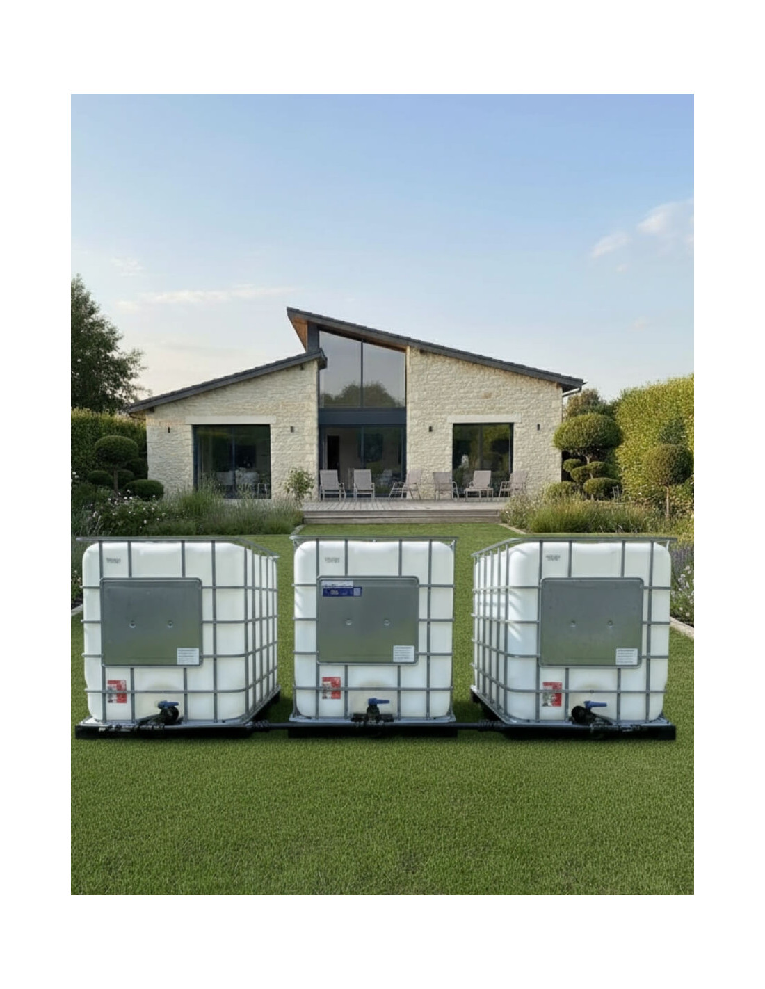 Récupérez jusqu’à 3 000 litres d’eau de pluie grâce à ce pack clés en main, composé de 3 cuves IBC reconditionnées de 1000 litres, raccordées entre elles via les kits de raccordement Multicuves (réf. 888018 + 888021).