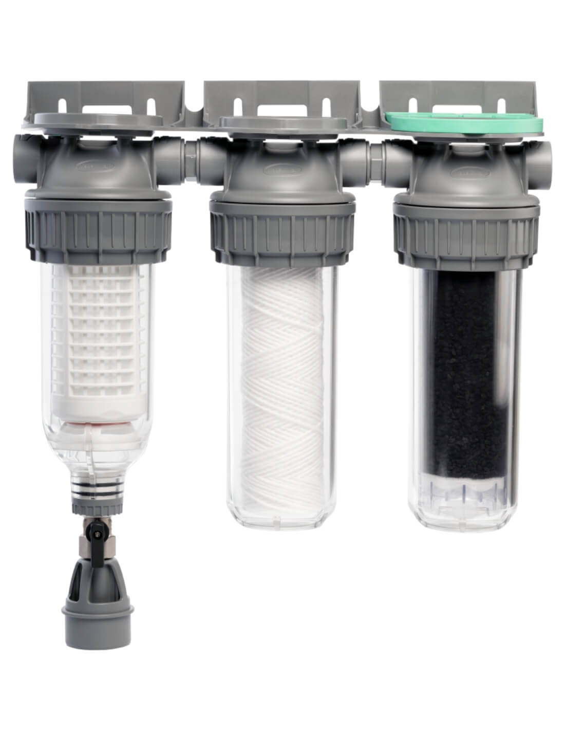 Le premier étage de filtration intègre un boîtier 7" avec vanne de vidange, spécialement conçu pour l’eau de pluie :
